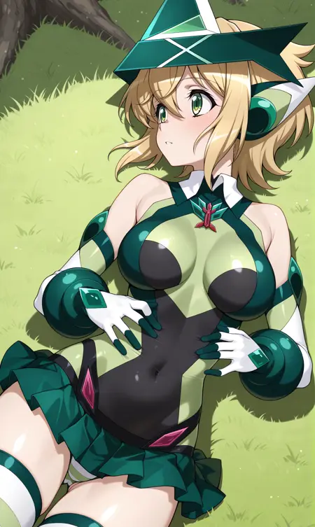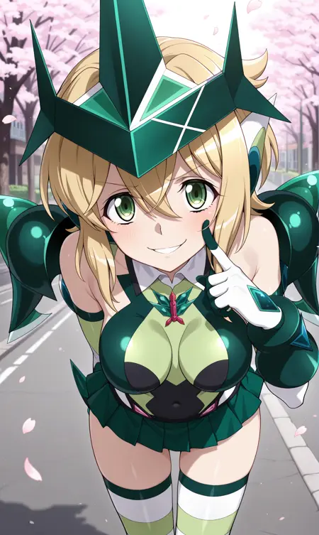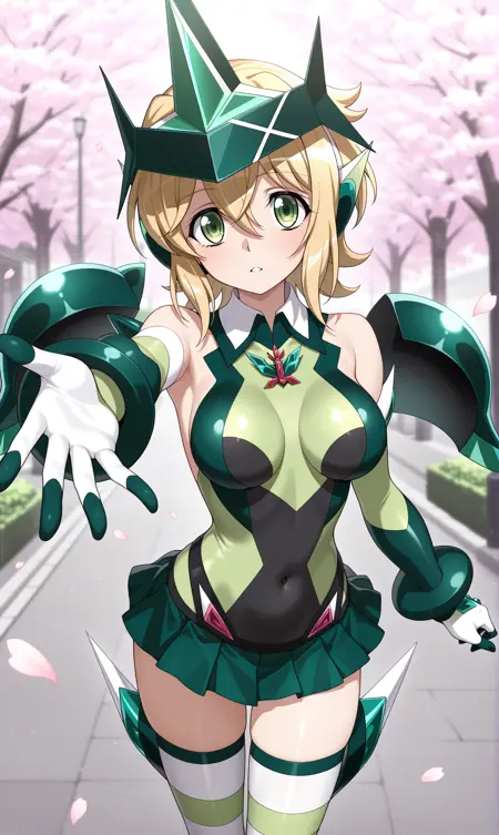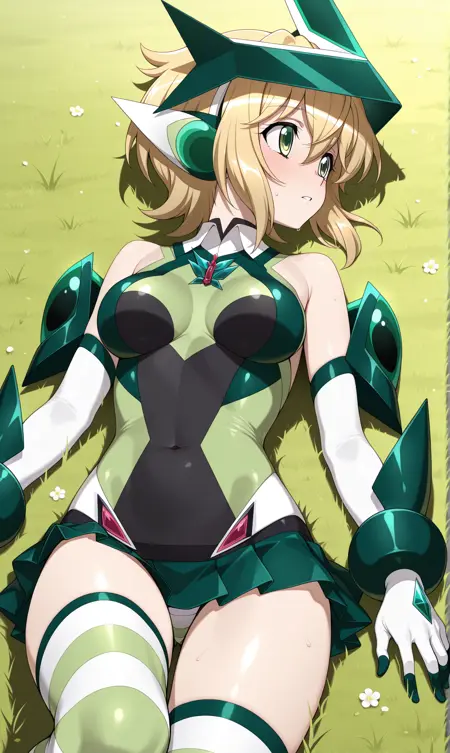green bodysuit, black bodysuit, microskirt, green skirt, armor, shoulder amor, jewelry, two-tone bodysuit, pleated skirt, covered navel, white detached collar, detached sleeves, two-tone gloves, striped thighhighs, headgear, symphogear pendant