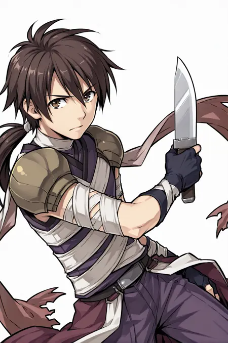 프롬프트: assROMale, 붕대, 어깨판, 어깨 갑옷, 손가락 없는 장갑, 소매 없는 보라색 셔츠, 찢어진 스카프, 허리 망토, 바지, 부츠,