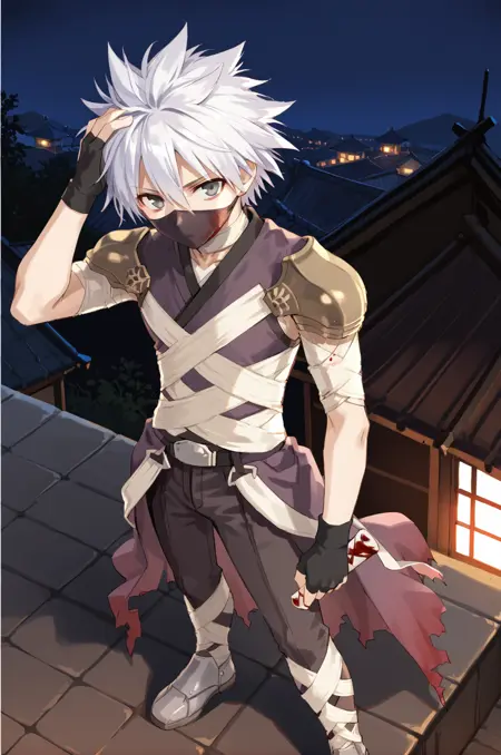 prompt: assROMale,绷带,肩甲,肩部护甲,露指手套,无袖紫色衬衫,破旧围巾,腰披,长裤,靴子,