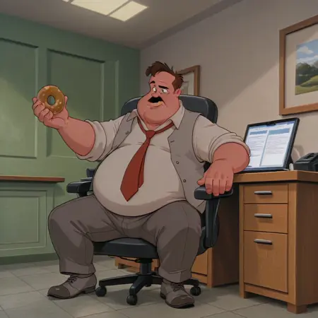 Lucky_Piquel, toon, mature male, human, caucasian, brown hair, mustache, black eyes, fat, overweight