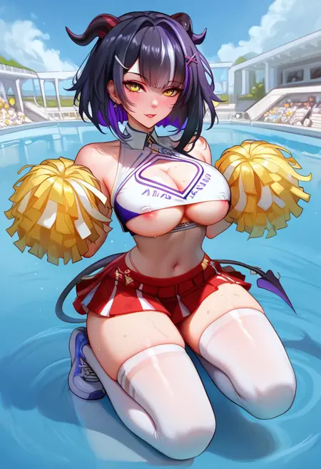 推荐标签:(Cheerleader_Uniform, pom pom (cheerleading), cheerleader, crop top, cleavage cutout, navel, skirt, panties, thighhighs, shoes),
