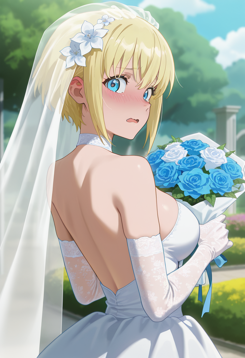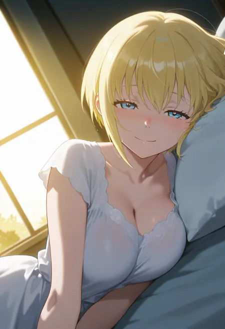 Tags for her look: 1girl, solo, short hair, blonde hair, large breasts, blue eyes,
