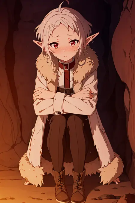 루디를 유괴하기 전 겨울옷: sylphiettedy, 뾰족한 귀, 짧은 머리, 흰 머리, 이마, 아호게, 붉은 눈, || 털 장식 갈색 긴 코트, 빨간 초커, 코트 밑 흰색 빨간 셔츠, 코트 밑 흰색 빨간 셔츠, 검은 바지, 갈색 부츠,