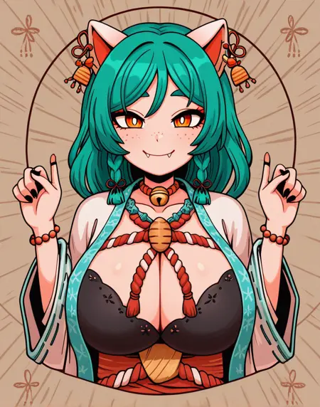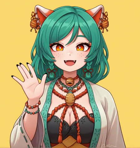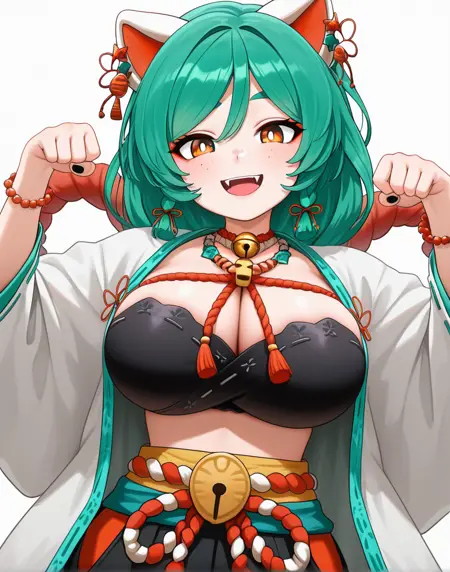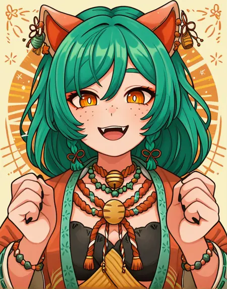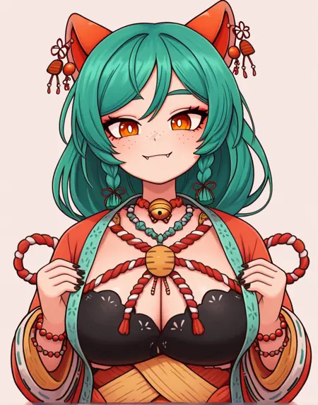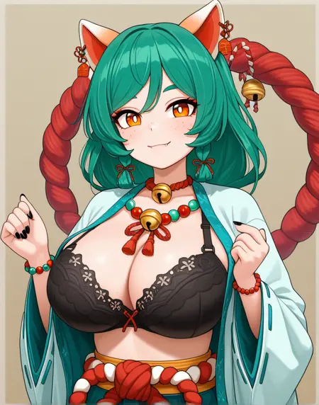 | 训练词汇 | orange eyes, long hair, animal ears, yellow eyes, braid, green hair,long hair, cat ears, twin braids, fangs, black nails, ear piercing, bright pupils, white pupils,freckles, eyebrows hidden by hair,已复制! japanese clothes, wide sleeves, necklace, bracelet, bell, piercing, rope, jingle bell, neck bell, beads, robe, shimenawa, bead necklace, bead bracelet, red rope, jewelry, bustier bra已复制! |
