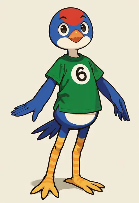 solo, male, anthro bird, blue body, red on forehead, yellow peak, white stomach, white chin, white neck, yellow legs, black eyebrows, hands, green six-ball tee