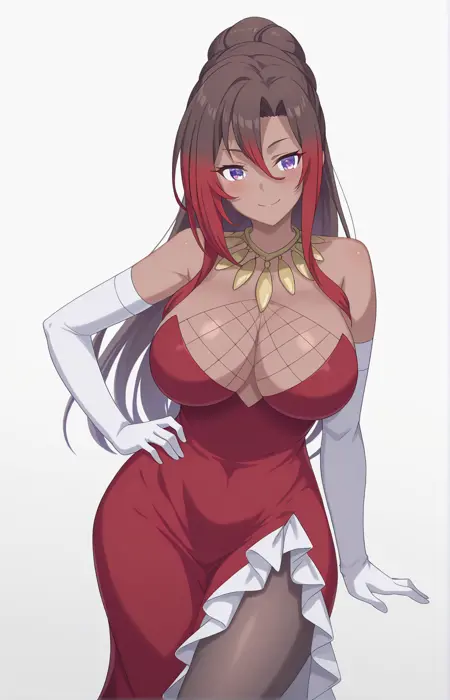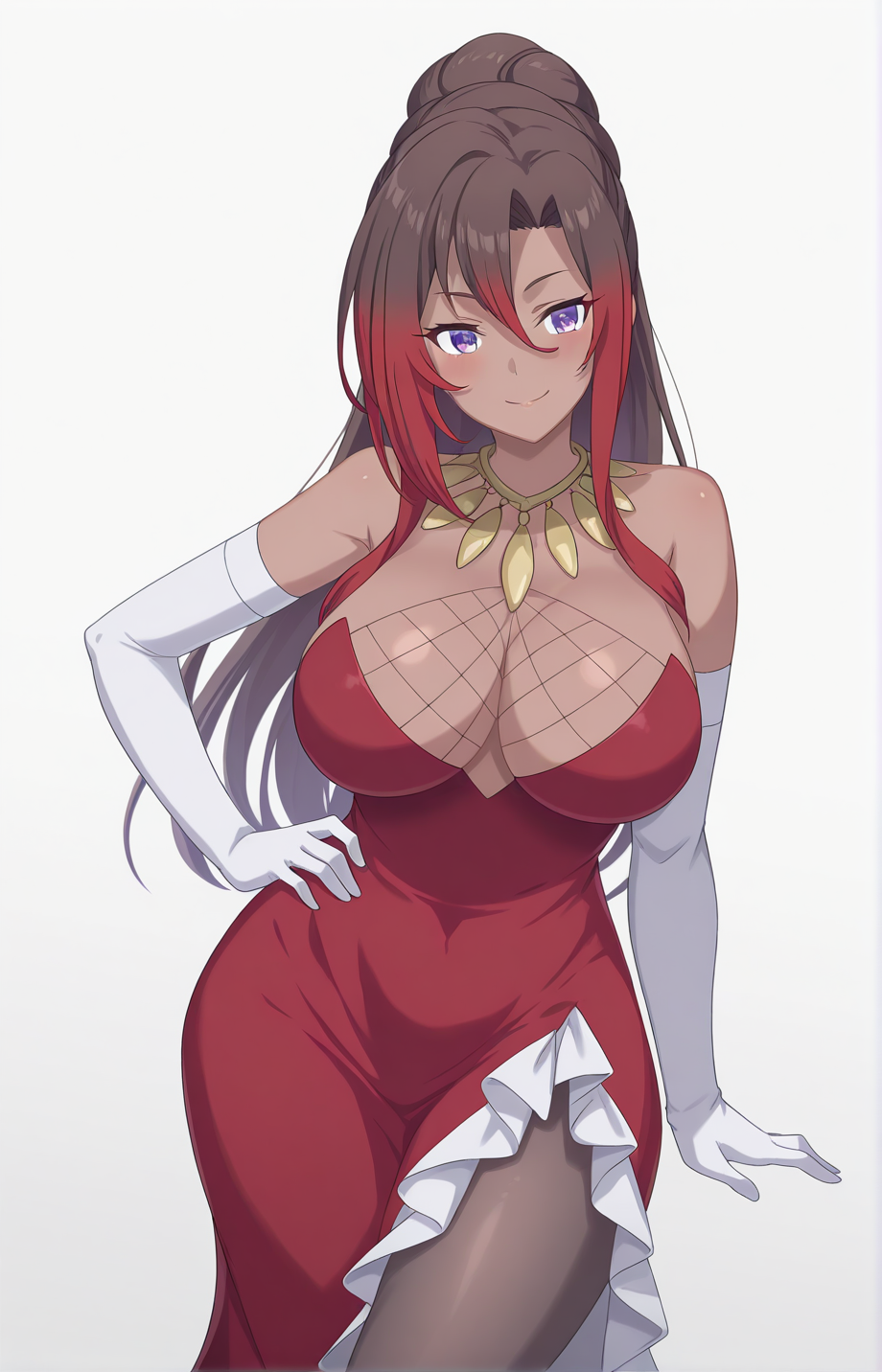 Sylvia-Liver020, 1girl, solo, long hair, brown hair, ponytail, hair between eyes, dark skin, purple eyes, jewelry, elegant, curvy, hourglass figure, large breasts, wide hips, red evening gown, plunging neckline, high leg slit, white ruffles, white opera gloves, red high heels, bare shoulders, multicolored hair, red hair, elbow gloves, white gloves, pantyhose, black pantyhose, black thigh-high stockings, hair bun