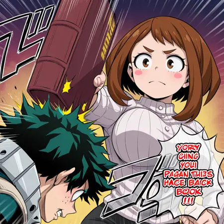 トリガー:mozgus_pagan_meme, mozgus_face, angry, hitting, hitting with book, speed lines, motion lines, speech bubble, text