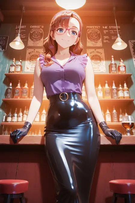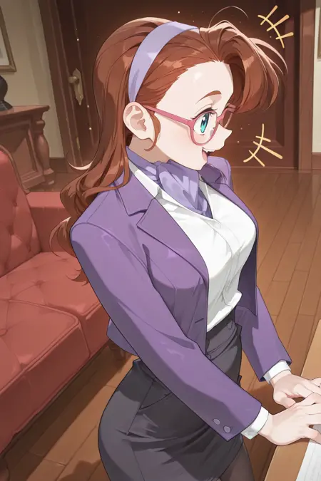 服装: 白衬衫,紫色夹克,紫色领结,连裤袜,铅笔裙,西装裙