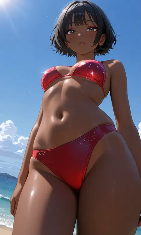 1girl,very dark skin,short hair,black hair,brown eyes,makeup,halterneck,red tank top,belt,jeans