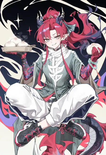 yu \(arknights\), smirk, looking at viewer, grey coat, black shirt, single earring, bead bracelet, hairband, single glove, fingerless gloves, black footwear, baggy pants, floating, half lotus position, holding chopsticks, baozi, abstract background