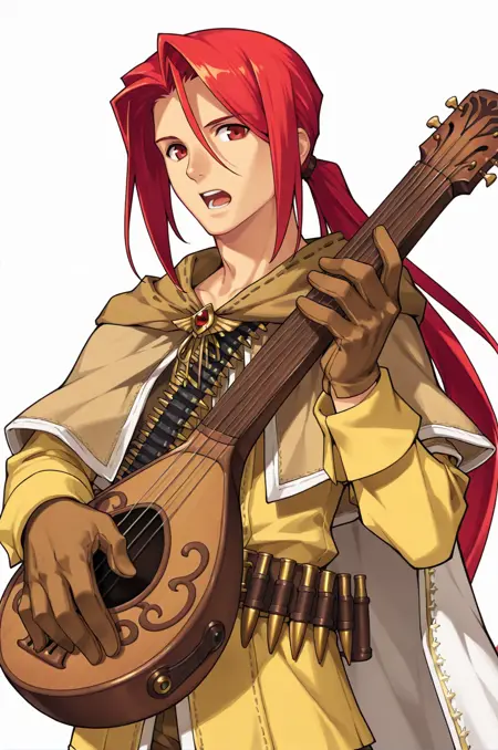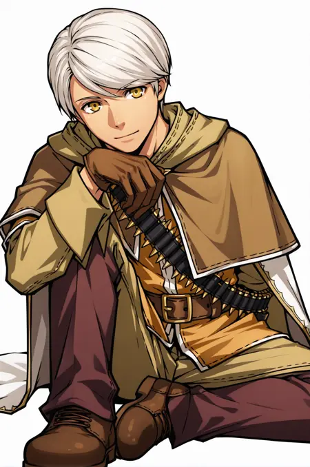 prompt: bardRO, brown gloves, white cape, brown capelet, bandolier, long sleeves, belt, pants, shoes