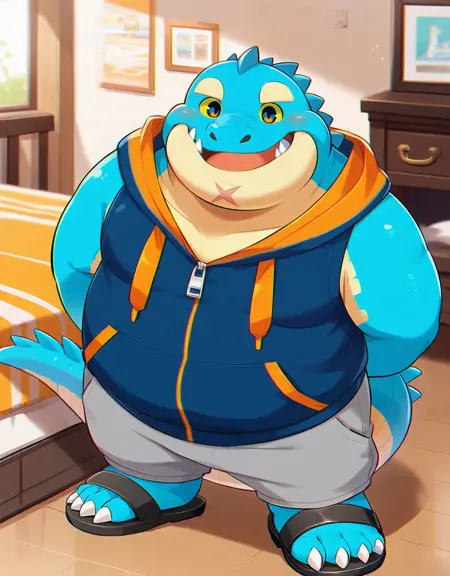 Related words : blue skin, yellow skin, rope, neckerchief, bandana, orange scarf, hat, bracelet, wristband, whistle around neck, striped shirt, sleeveless shirt, tank top, sleeveless hoodie, hood, grey shorts, hooded jacket, zipper pull tub