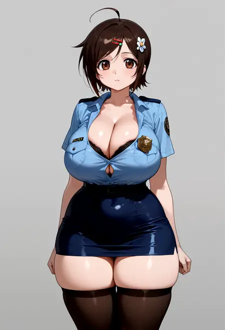 police uniform, alternate costume, short skirt, bra peek, black bra, cleavage, overflowing breasts, bursting breasts, (cleavage bulge:1.2), police badge, thighhighs, zettai ryouiki,