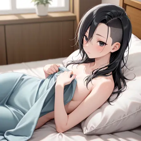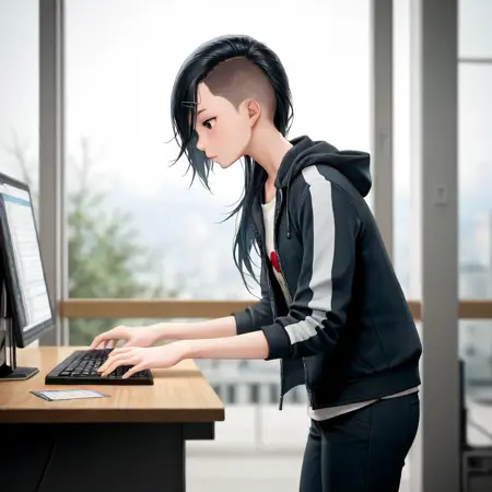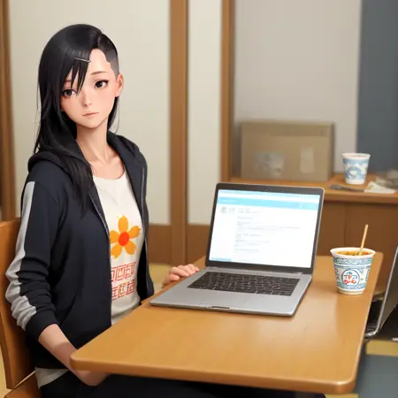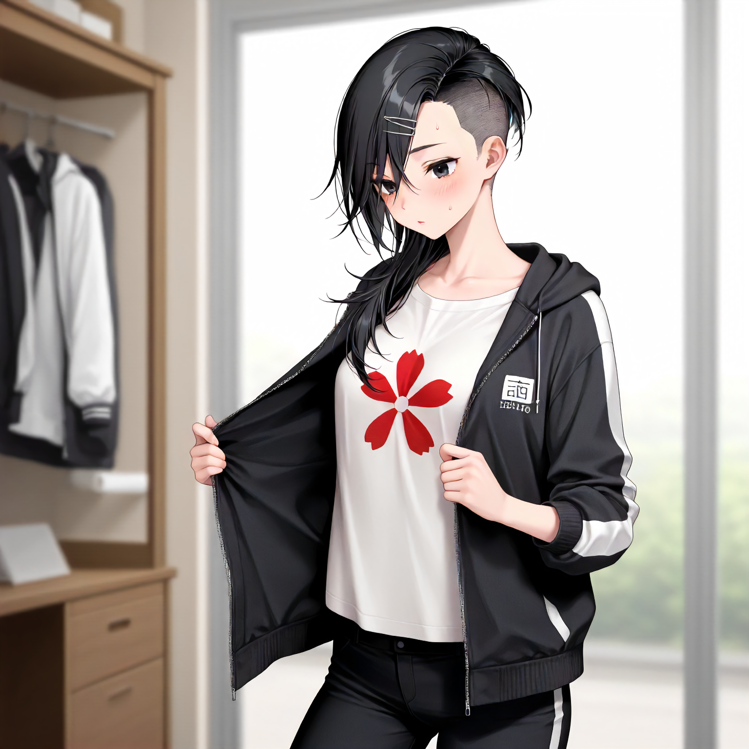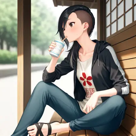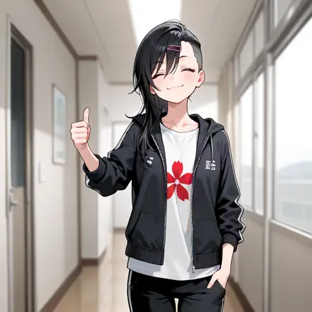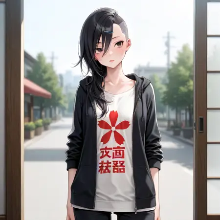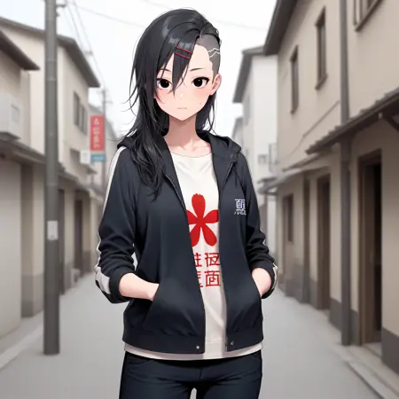 rinko, black hair, black eyes, long hair, undercut hair, hairclip, shirt, jacket, pants, sandals,