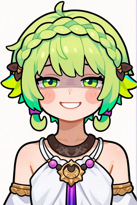 기본 외모: 녹색 머리카락, 녹색 눈, 왕관 땋은 머리, 보라색 머리관, 갈색 머리 장식, 어지러운 머리, 옆머리