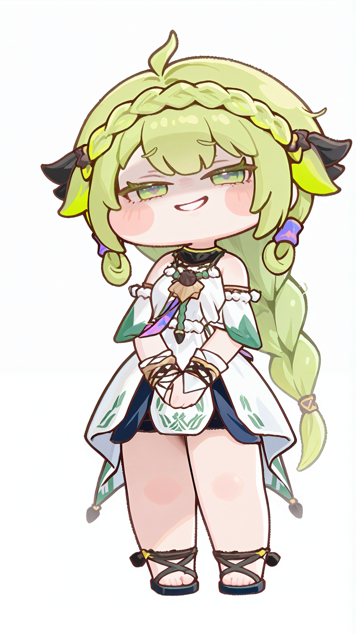기본 옷차림: 어깨 노출, 흰색 드레스, 분리된 소매, 모래신발, 다리 노출