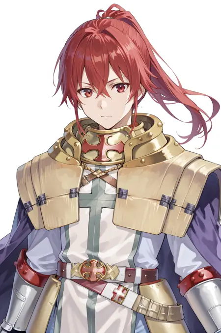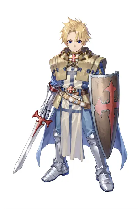 prompt: crusadeROMale, shoulder armor, cape, gauntlets, belt, tabard, pants, red cross, pelvic curtain, armored boots
