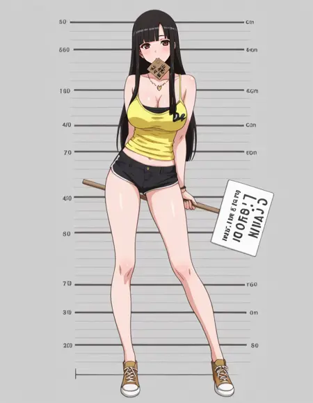 mai_kurobane_mizutsu,long_hair,black_hair,brown_eyes,hat,dark_purple_jacket,fur_trim,necklace,midriff,tank_top,belt,layered_skirt,thighhighs,yellow_high_heels,ankle_strap