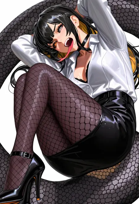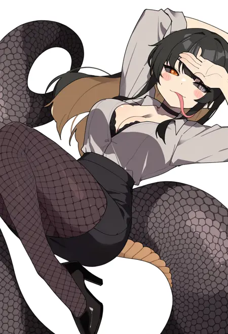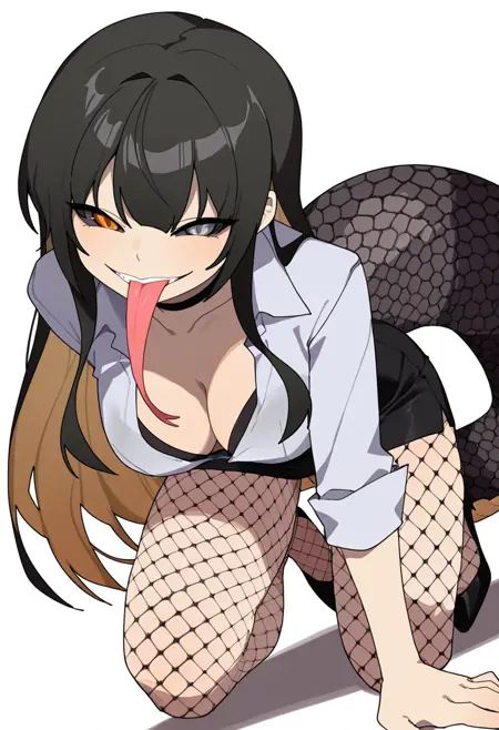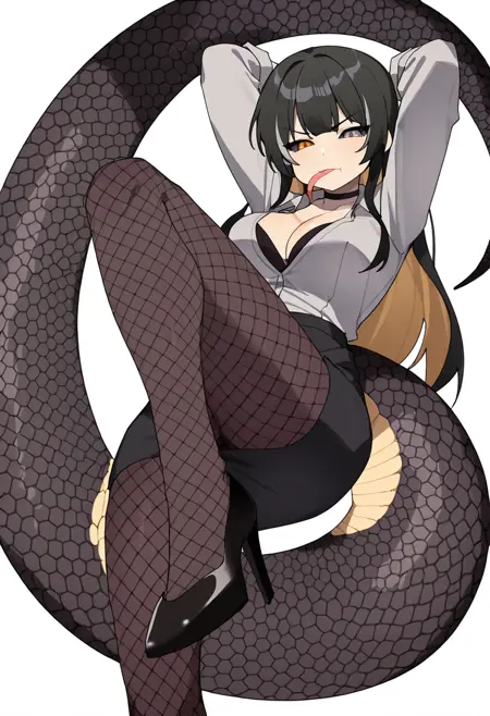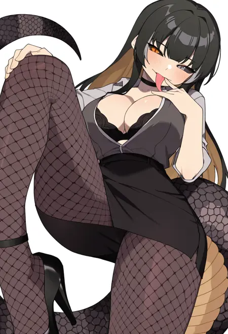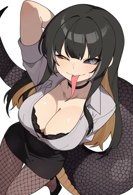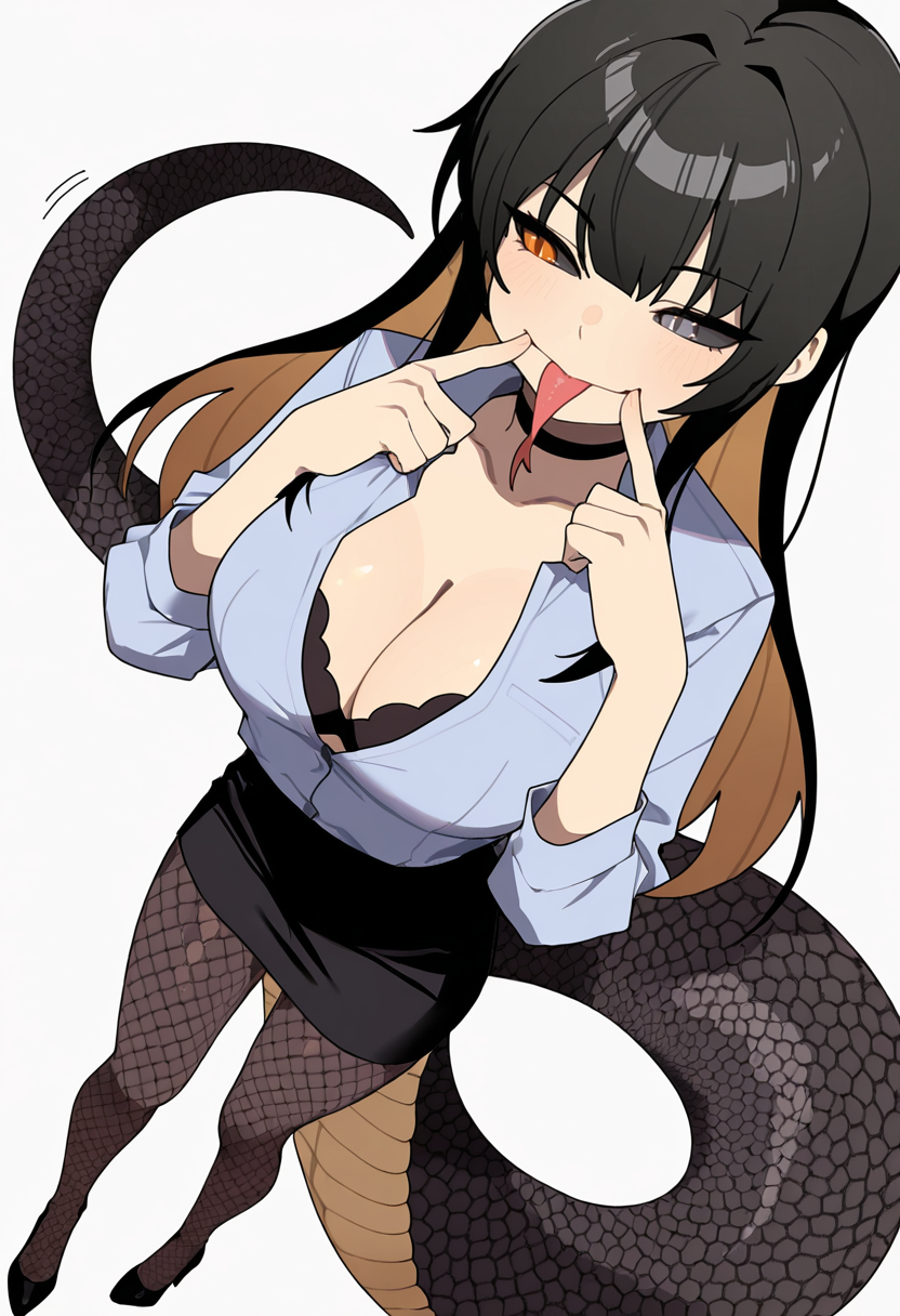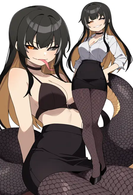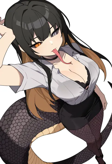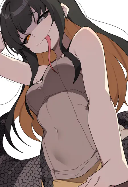 cobra_cnr, 1girl, long hair, black hair,colored inner hair,heterochromia,orange eyes, grey eyes,slit pupils,black sclera, forked tongue,long tongue,scales, monster girl, lamia, snake tail,
