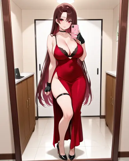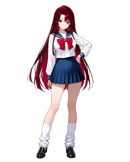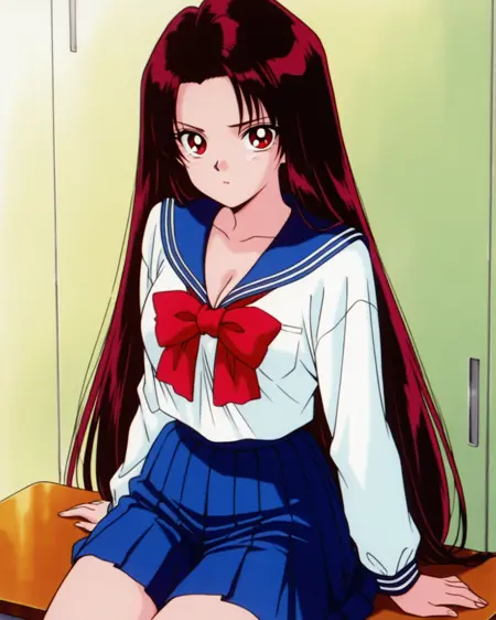 Izuna Hazuki, Izuna, 1girl, school uniform, long hair, solo, skirt, reddish brown hair, serafuku, dark red eyes, bow, sitting, blue skirt, pleated skirt, cleavage, very long hair, sailor collar, breasts, looking at viewer, blue sailor collar, long sleeves, red bow