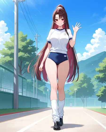 Izuna Hazuki, Izuna, 1girl, solo, reddish brown hair, buruma, long hair, gym uniform, waving, blue buruma, very long hair, outdoors, smile, socks, loose socks, shirt, day, shoes, ponytail, looking at viewer, sky, full body, short sleeves, white shirt, high ponytail, dark red eyes, standing, cloud, tree, white socks, black footwear