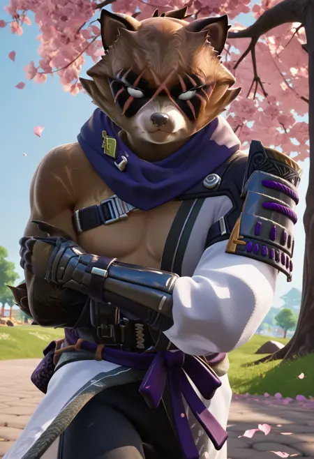 hajime,拟人化的浣熊,男性,肌肉发达,紫色围巾,白色发光的眼睛,黑色面部彩绘,面部疤痕,手臂疤痕,棕色和米色毛发,浣熊尾巴,尖耳朵,绿色镶边的白色和服,紫色腰带,黑色长裤,紫色绳索绑带的肩甲,背部紫色 pouch,装甲靴子,手甲,皮革绑带,带爪的脚,带爪的手,战术装备,