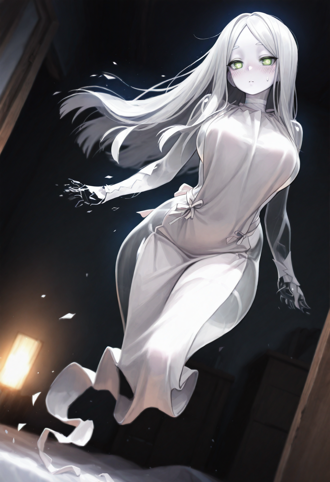 ittanmomenmge, ghost, ghost tail, white skin, colored skin, see-through, floating, no hands, wind