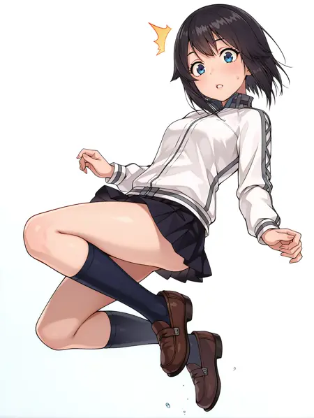 服装:h_clothes, 高领, 白色运动夹克, 长袖, 黑色迷你裙, 过膝袜, 乐福鞋,