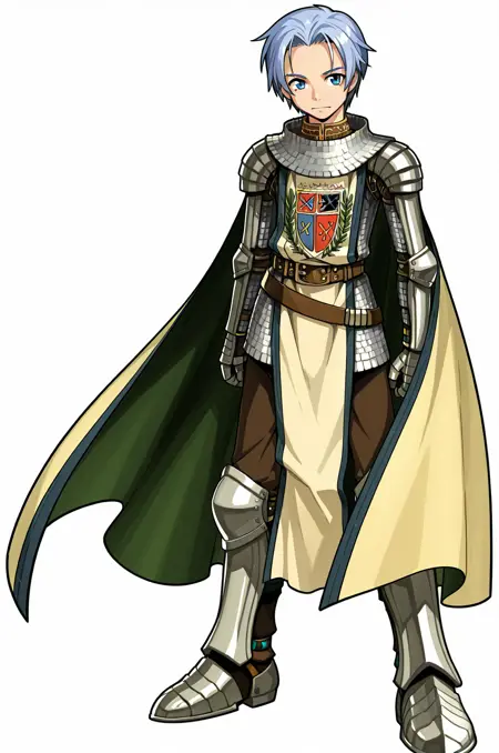 prompt: knightROMale, cape, silver gauntlets, brown collar, silver pauldrons, silver shoulder armor, chainmail, emblem, belt, full silver armor, tabard, pelvic curtain, brown pants, silver greaves,
