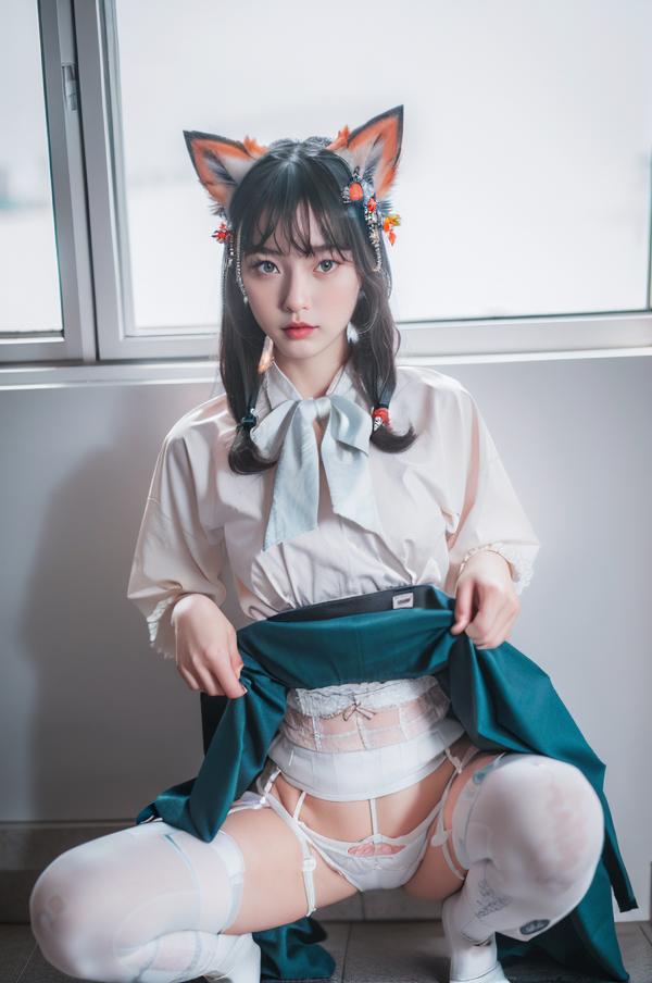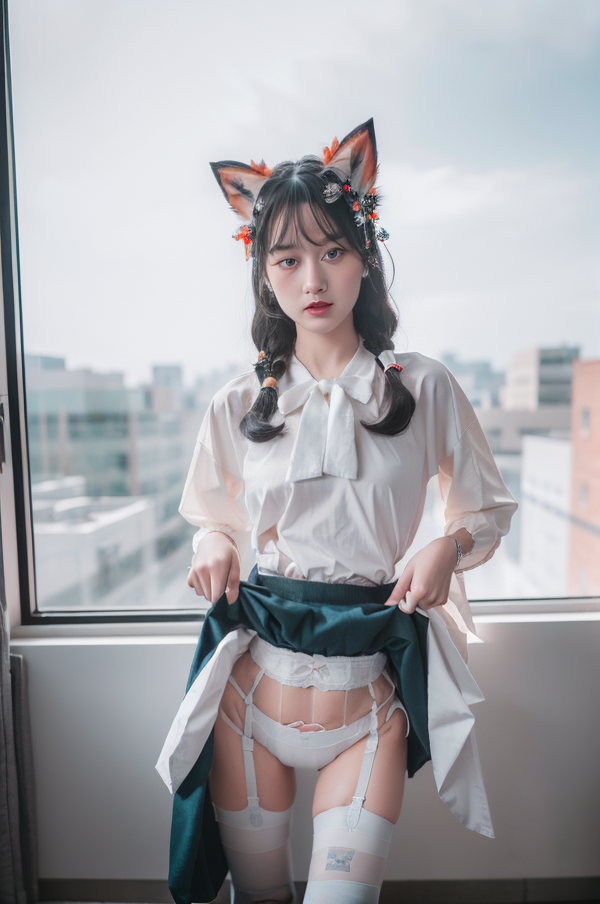 Prompt word:animal-ear-skirt, thighhighs, animal ears, skirt, white thighhighs, panties, white panties, shirt, hair ornament, white shirt, clothes lift, ass, garter belt, lifted by self, skirt lift