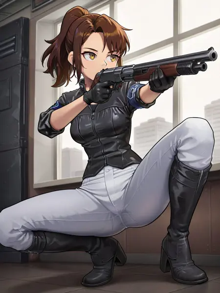 袖をまくった、黒いジャケット、レザー、レザージャケット、ジッパー、腕章、手袋、黒い手袋、ズボン、白いズボン、ブーツ、膝丈ブーツ、ハイヒール、ハイヒールブーツ、黒い靴、ズボンをブーツの中にしまう