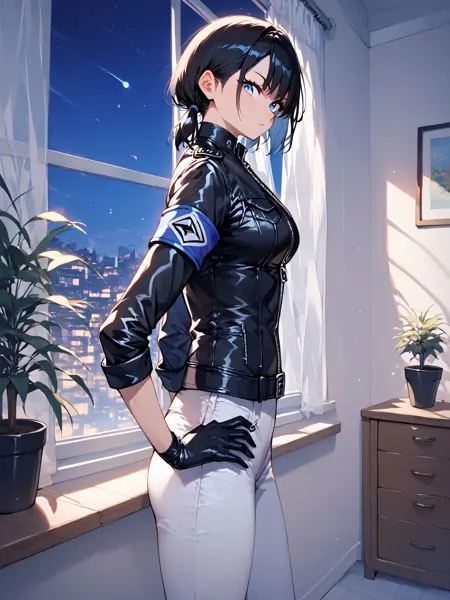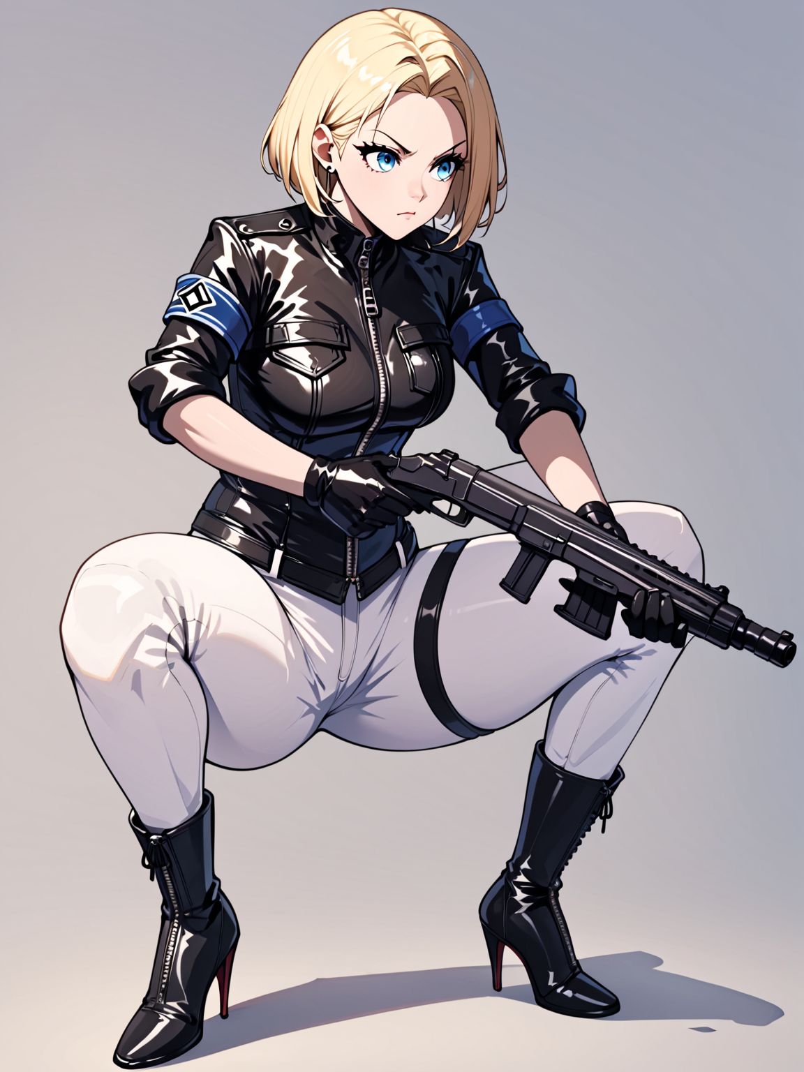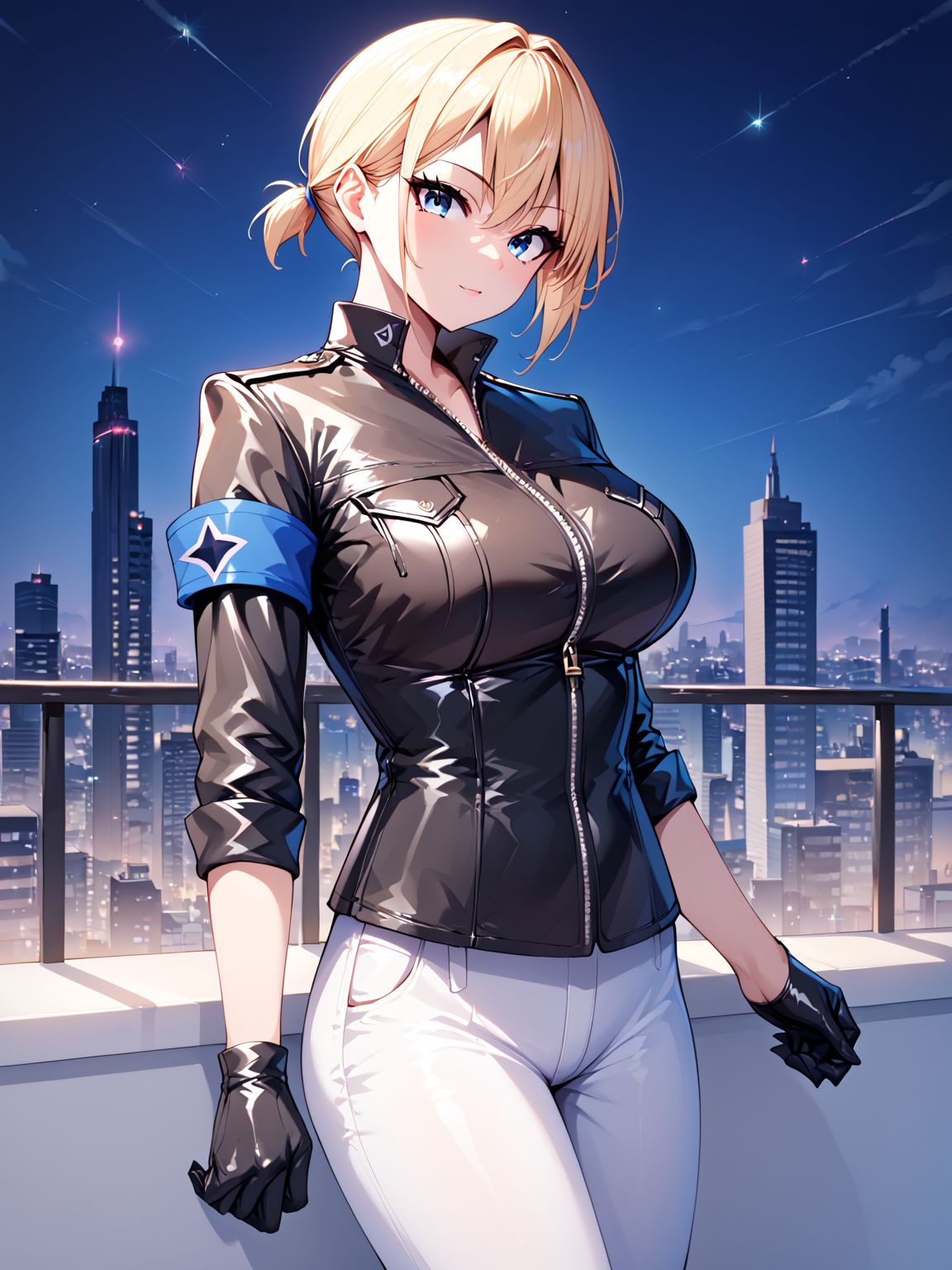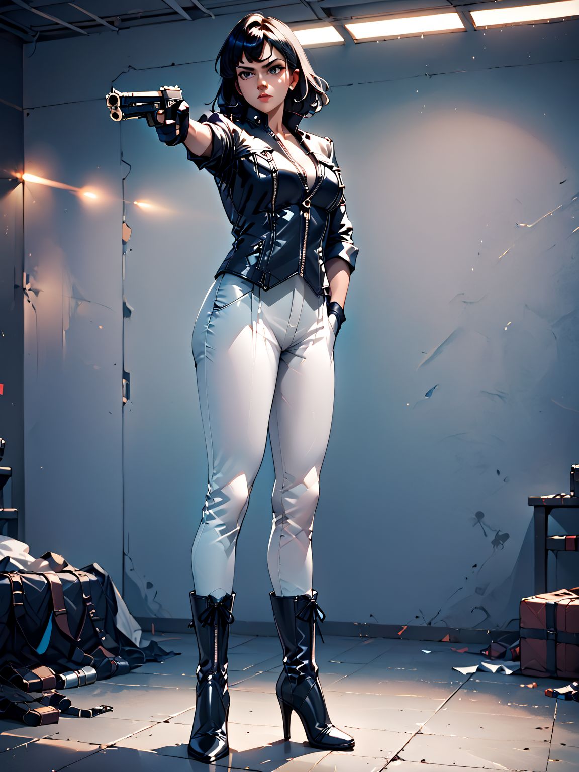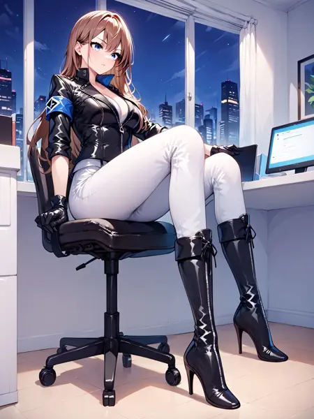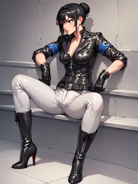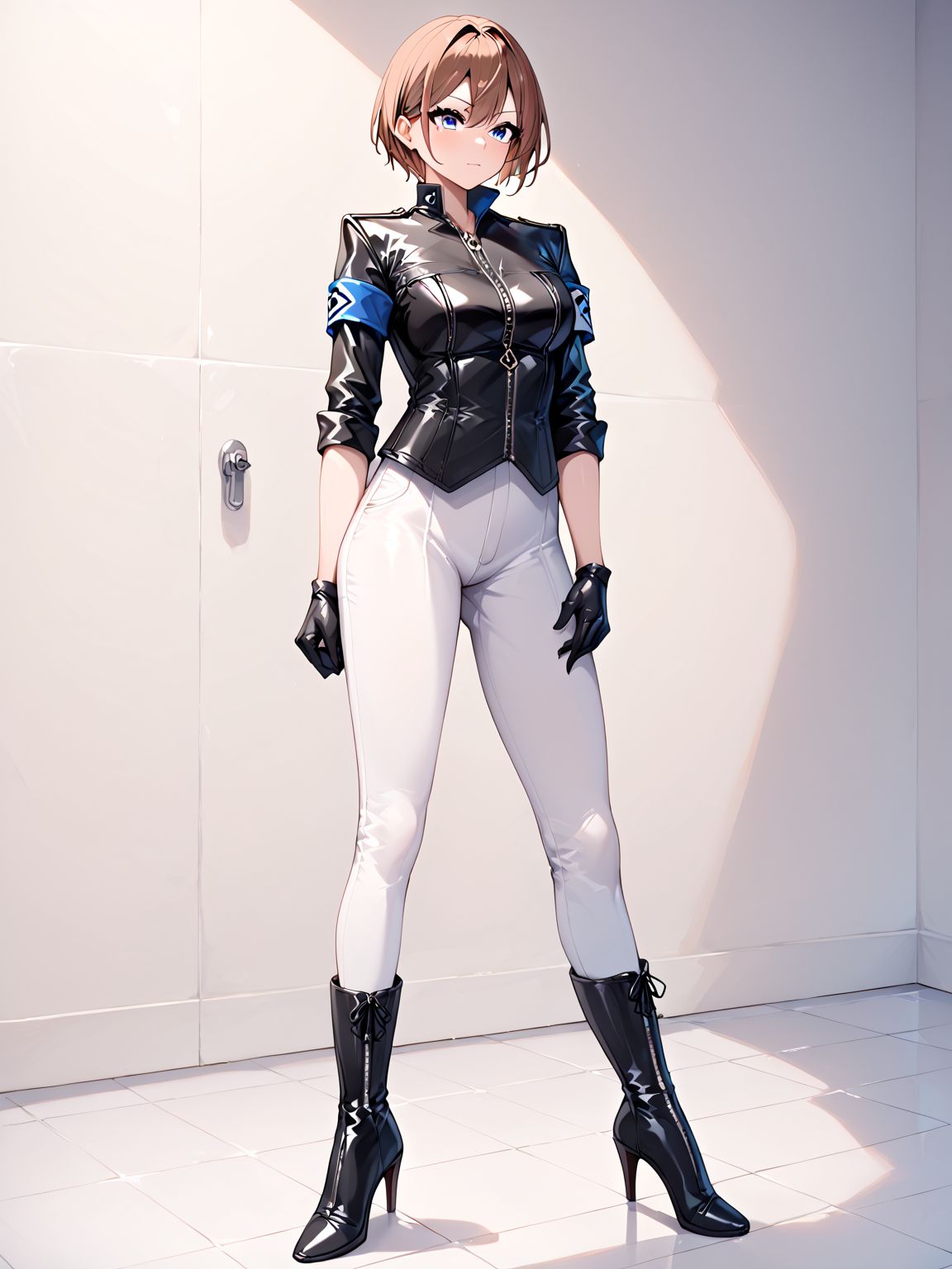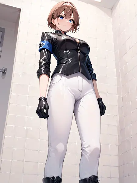 소매를 걷어올린, 검정 재킷, 가죽, 가죽 재킷, 지퍼, 팔찌, 장갑, 검정 장갑, 바지, 흰색 바지, 부츠, 무릎 부츠, 하이힐, 하이힐 부츠, 검정 신발, 바지 끝을 안으로 넣음