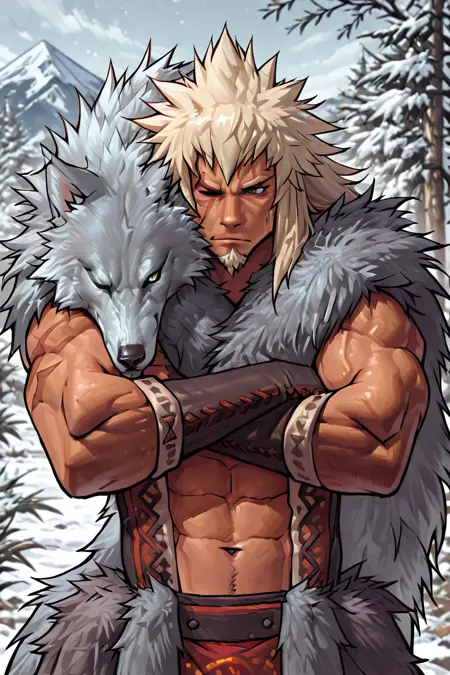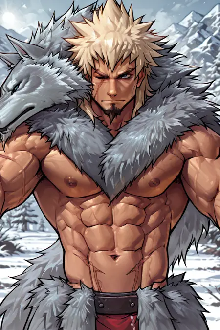 Prompt:0rca, manly, facial hair, scar, golden hair, long hair, spiked hair, goatee, wolf, pelage