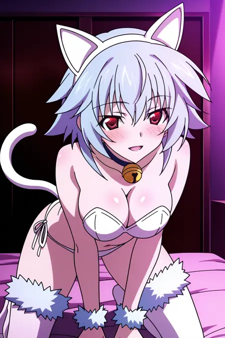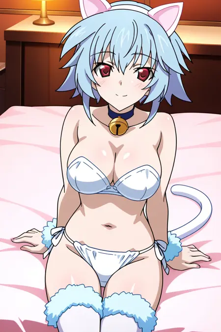 sarashiki tatenashi, 1girl, solo, blue hair, short hair, red eyes, large breasts, underwear only, white bra, strapless bra, white panties, side-tie panties, white hairband, fake animal ears, cat ears, cat tail, fur-trimmed wrist cuffs, white thighhighs, fur-trimmed thighhighs, neck bell, blue choker