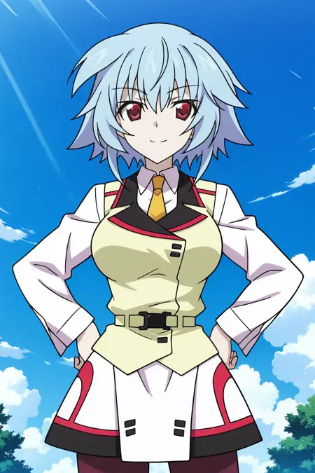 sarashiki tatenashi, 1girl, solo, blue hair, short hair, red eyes, large breasts, infinite stratos academy school uniform, school uniform, white dress, collared dress, long sleeves, yellow vest, yellow belt, yellow necktie, pantyhose