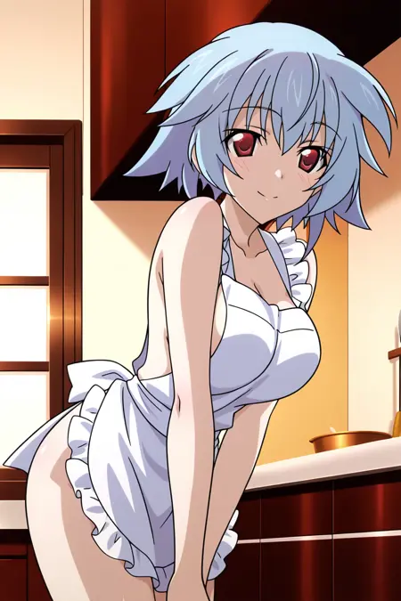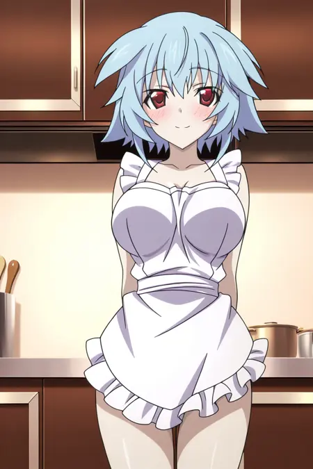 sarashiki tatenashi, 1girl, solo, blue hair, short hair, red eyes, large breasts, white apron, frilled apron, naked apron
