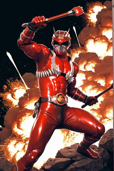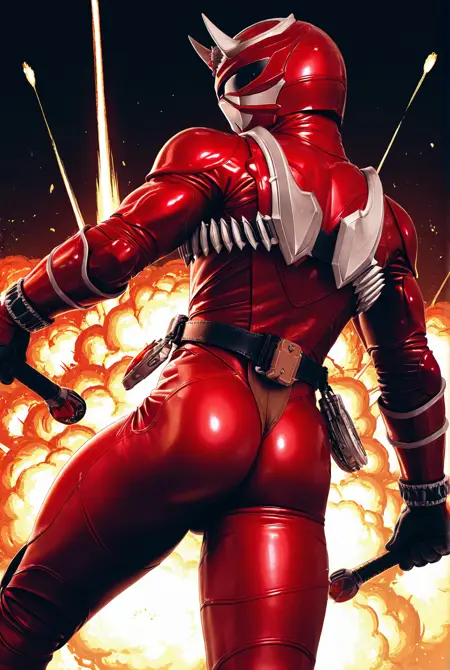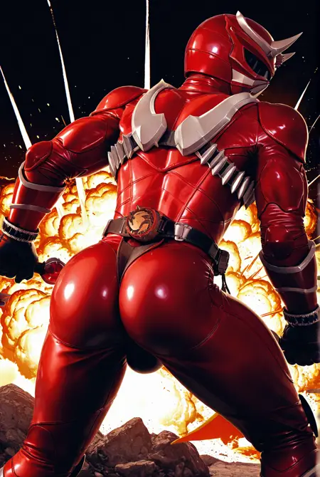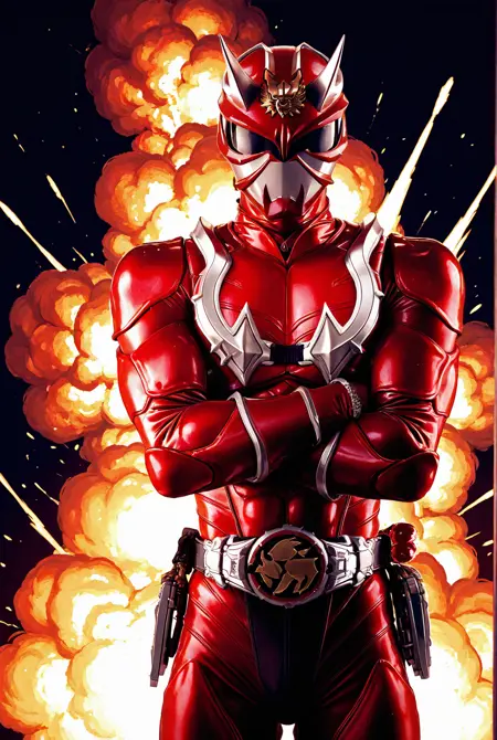 h1b1k1 kurenai, helmet, belt, bodysuit, tokusatsu, armor, red bodysuit, horns, boots