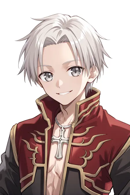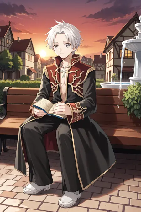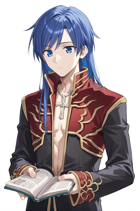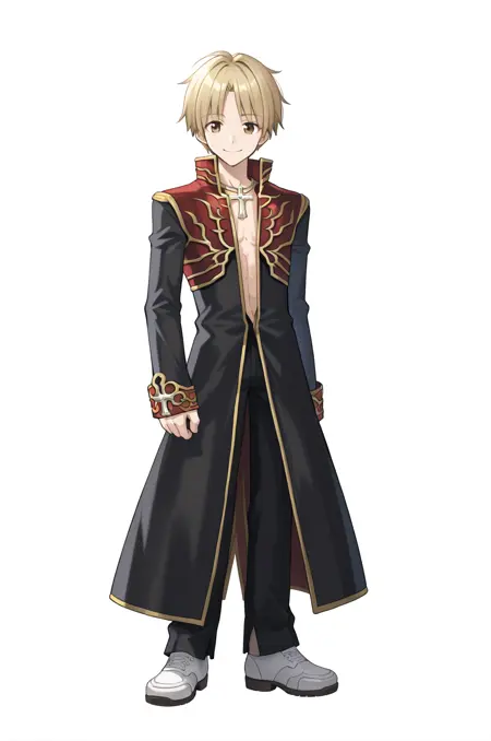prompt: priestROMale, cross necklace, two-tone coat, red coat, black coat, long sleeves, open coat, high collar, shoes