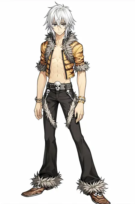prompt: rogueROMale, 手链, 背心, 老虎纹, 开襟夹克, 赤裸上身, 毛皮镶边, 皮带, 黑色长裤, 骷髅扣, 棕色鞋子,