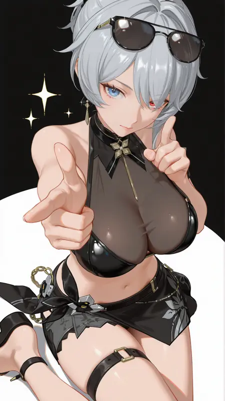 头:mi ying · guo chang li(aether gazer)(mi xia qi ying),1girl,solo,short hair,grey hair,blue eyes,red eyes,heterochromia,sunglasses,eyewear on head,earrings,