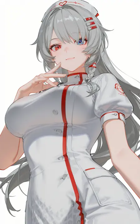 mi ying · guo chang li(aether gazer)(hu li shi jian),1girl,solo,hat,nurse cap,blue eyes,grey hair,hair ornament,short hair,hair over one eye,