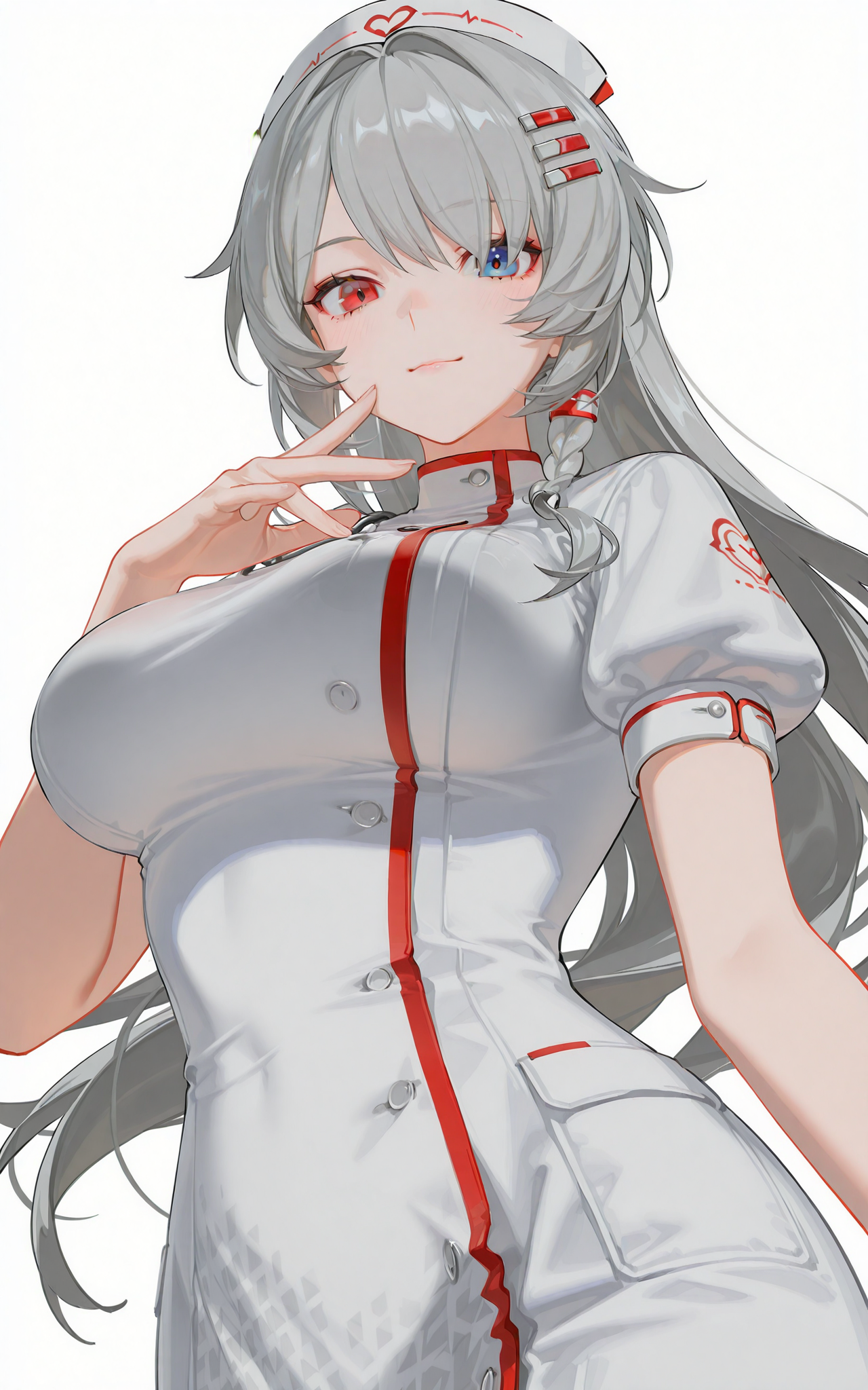 頭:mi ying · guo chang li\(aether gazer\)\(hu li shi jian\),1girl,solo,hat,nurse cap,blue eyes,grey hair,hair ornament,short hair,hair over one eye,