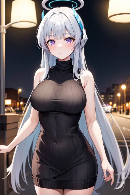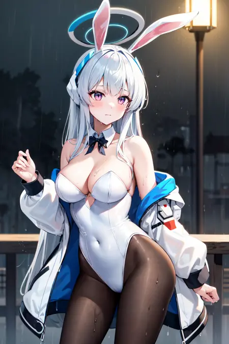 outfit1aanoa, long hair, headgear, mechanical halo, large breasts, blue necktie, white shirt, off shoulder, white jacket, open jacket, long sleeves, white skirt, pleated skirt, black pantyhose