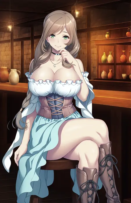 Lora for Sarashina Chihiro, from Isekai Enkou. Recommended weight: 0.9. Trigger word: SarashinaChihiro. Prompt for casual outfit: skirt, cleavage, bare shoulders, jewelry, collarbone, detached sleeves, choker, necklace, blue skirt, corset, knee boots, cross-laced footwear, lace-up boots. Negative prompt for NSFW: censored.