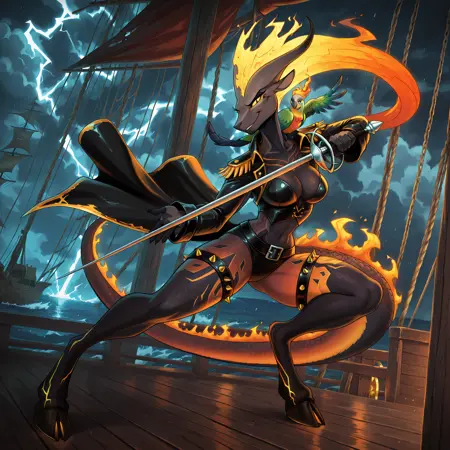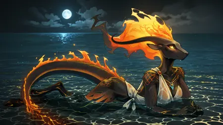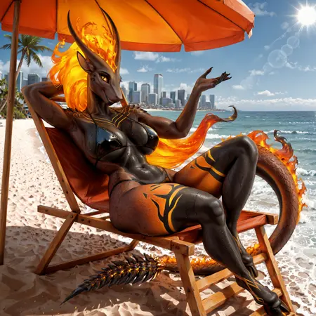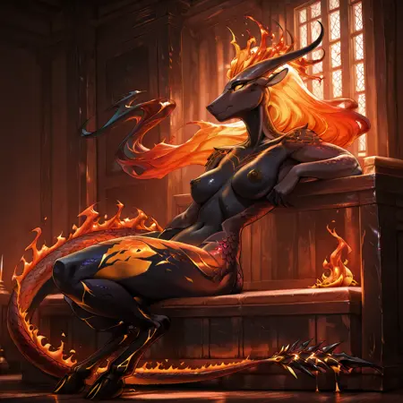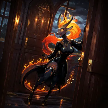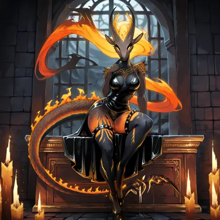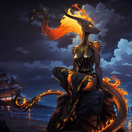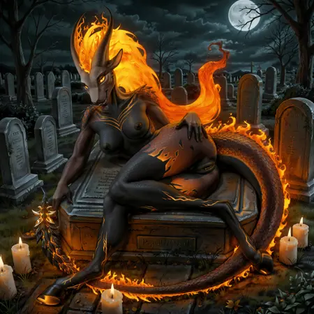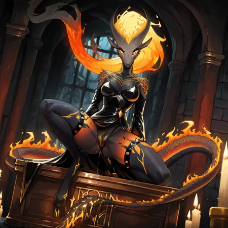pompeii, demon girl, fiery hair, yellow sclera, animal ears, horns, scales, flame on tail, hooves