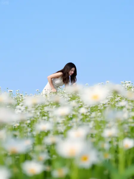 一位年轻女子,留着长长的黑发,身穿浅蓝色蕾丝连衣裙,内搭白色高领衫,背景是郁郁葱葱的绿色植被,盛开着洁白的花朵。她神情柔和宁静,头戴白色蕾丝发带,饰有精致的小装饰元素。画面散发出柔和空灵的氛围,自然光线增强了花卉与绿植的细节。