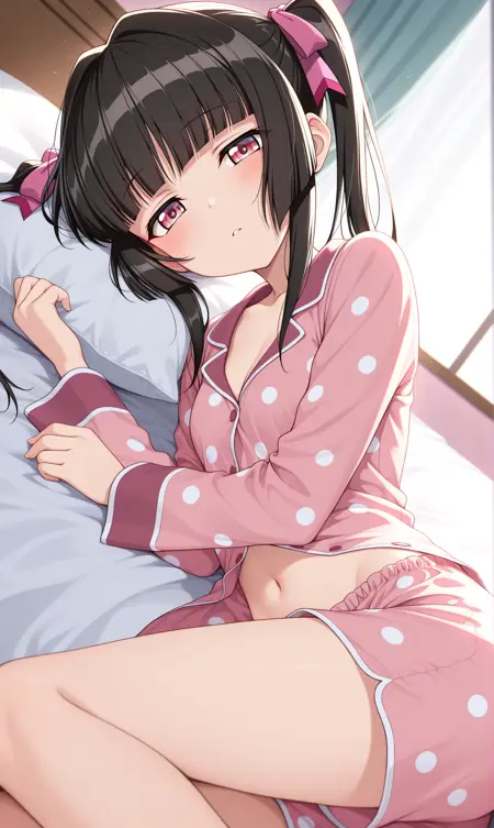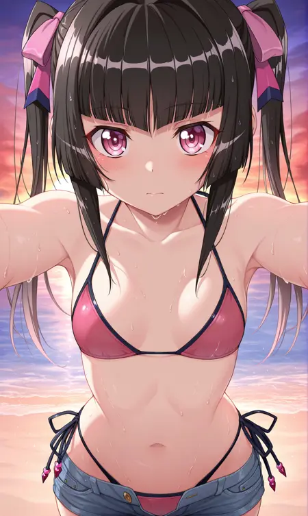sidelocks, tsukuyomi shirabe, pink eyes, black hair, blunt bangs, twintails, hair ribbon