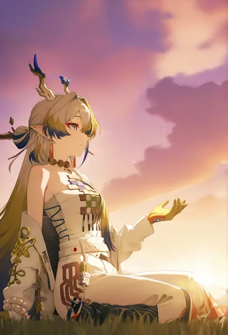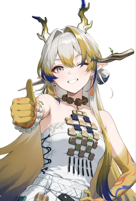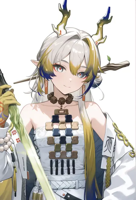 <lora:Arknights-ShuV1-Nuclear1811-IL>,tail,horns,makeup,eyeliner,Shu,grey eyes,red pupils,grey hair,multicolored hair,blonde hair,streaked hair,blue hair,colored tips,long hair,very long hair,red eyeliner,bangs,hair between eyes,hair intakes,dragon horns,pointy ears,dragon tail,dragon girl,df hair ornament,df branch,df hair stick,df leaf,df branch hair stick,df jewelry,df earrings,df tassel earrings,df collarbone,df bare shoulders,df off shoulder,df necklace,df tassel,df strapless,df strapless shirt,df bracelet,df bracelet on the right hand,df beads,df white beads,df prayer beads,df bead bracelet,df colored skin,df colored hands,df yellow hands,df gradient colored hands,df hand tattoo,df colorful hand tattoo,df pants,df white pants,df colored elbow,df gradient colored elbows,df socks,df black socks,df socks under pants,df shoes,df black footwear,df boots,df ankle boots,df cross-laced footwear,df lace-up boots,df shoelaces,df white shoelaces,lh