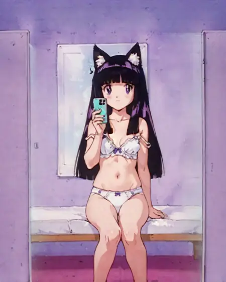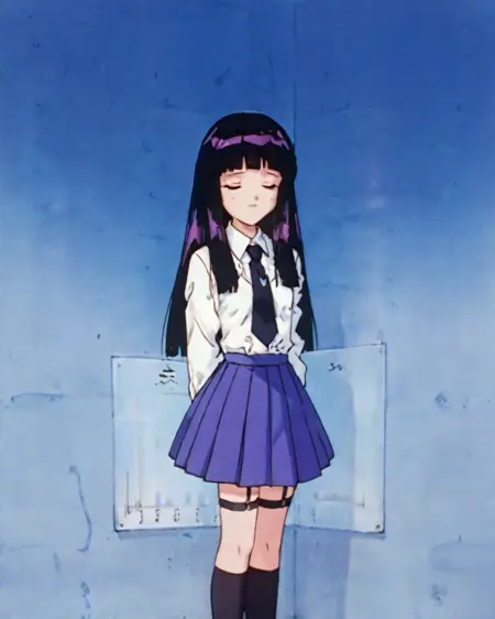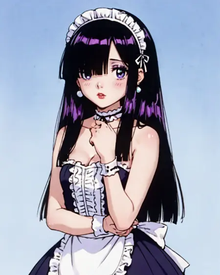 Shizuka Kikuchi, Shizuka, 1girl, solo, long hair, black with purple highlights hair, violet eyes, small breast