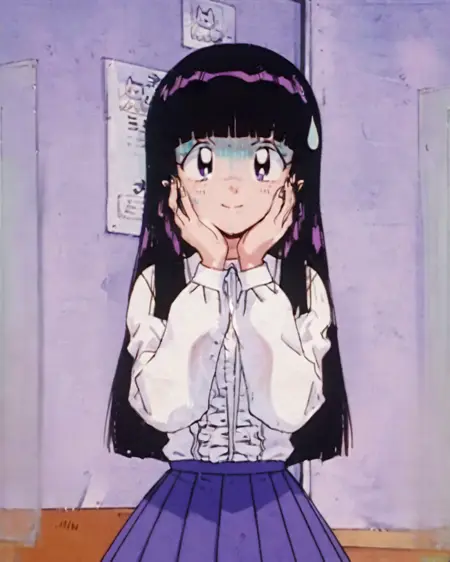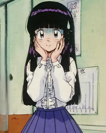 Shizuka Kikuchi, Shizuka, 1girl, solo, long hair, black with purple highlights hair, violet eyes, small breast, skirt, sweatdrop, blunt bangs, shirt, white shirt, pleated skirt, smile, long sleeves, blue skirt